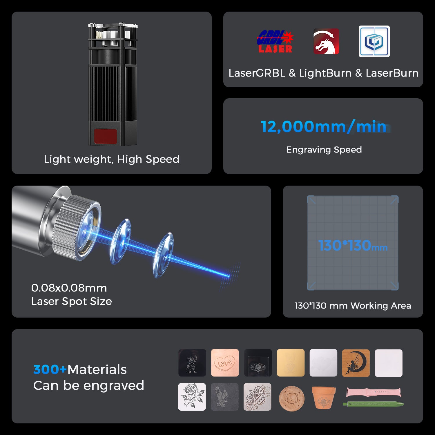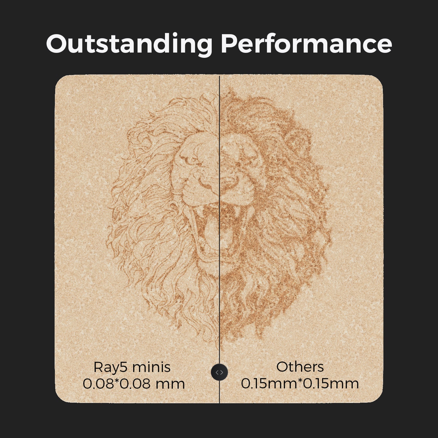Avec une puissance optique d'environ 5 à 5,5 W, la MiniS 5.5W offre une réserve de puissance nettement supérieure aux versions plus petites. Elle permet ainsi une gravure plus rapide, un contraste plus marqué et une découpe plus fiable des matériaux très fins, tout en conservant un format compact et une fiabilité accrue. La MiniS 5.5W est donc parfaitement adaptée aux amateurs exigeants, aux établissements d'enseignement et aux fablabs recherchant des performances optimales dans un format mini et un système fermé.