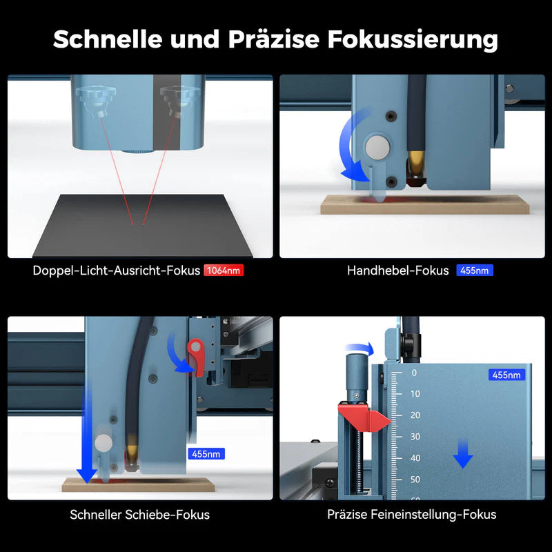 4. Système de mise au point précis : Le levier de mise au point de la tête laser est solidement fixé et permet un réglage précis. La molette rouge située à droite permet un réglage grossier de la hauteur du module laser par rapport au matériau ; la molette supérieure sert au réglage fin.