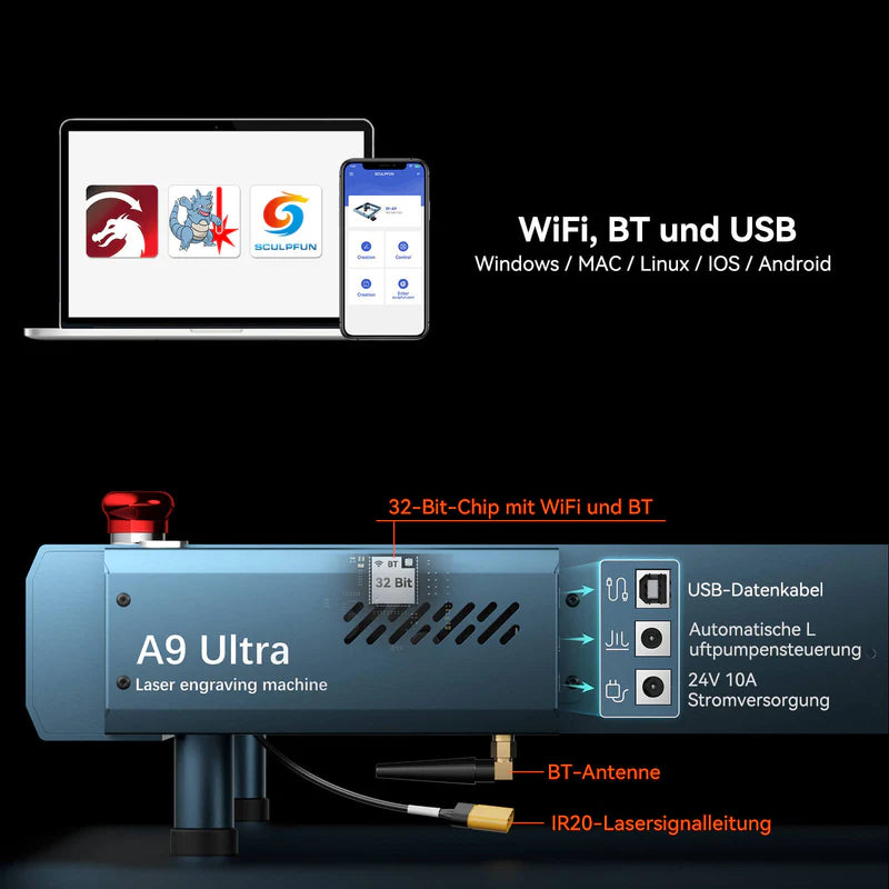 7. Plusieurs options de connectivité : Wi-Fi, USB et Bluetooth. Compatible avec l’application Sculpfun pour smartphones et les logiciels LightBurn et LaserGRBL pour PC.