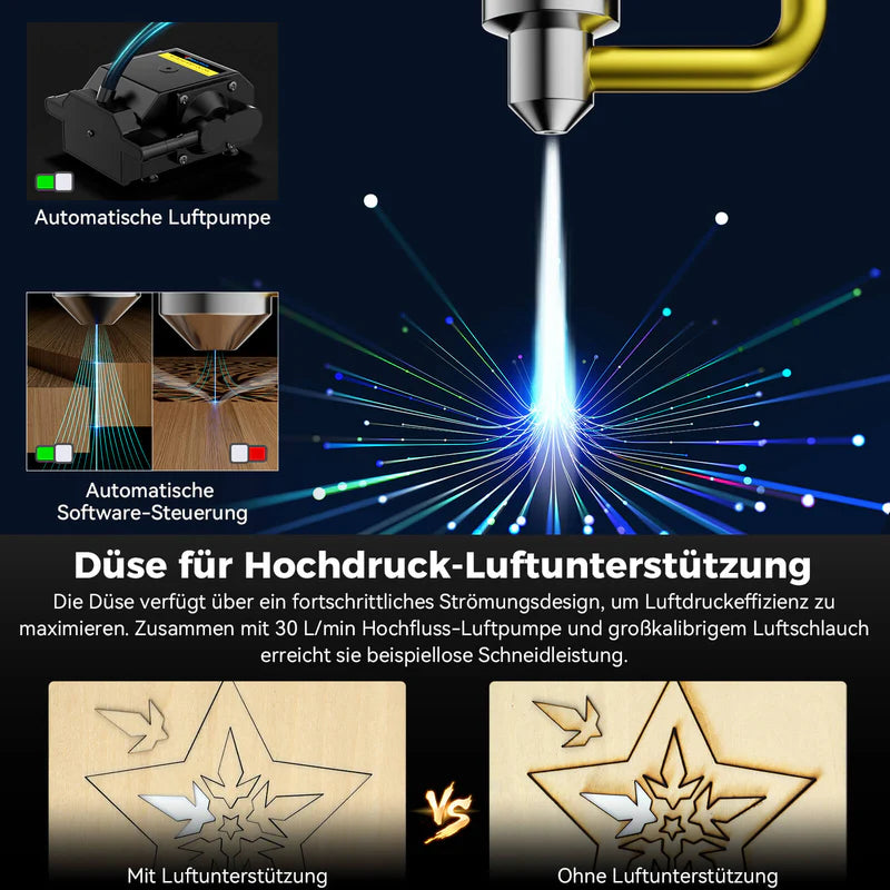 8. Assistance pneumatique automatique : Un flux d'air optimisé avec un grand diamètre intérieur améliore la qualité de coupe et prolonge la durée de vie de la lentille laser grâce à un meilleur nettoyage pendant la coupe.
