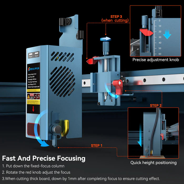 4. Système de mise au point précis : Le levier de mise au point de la tête laser est solidement fixé et permet un réglage précis. La molette rouge située à droite permet un réglage grossier de la hauteur du module laser par rapport au matériau ; la molette supérieure sert au réglage fin.